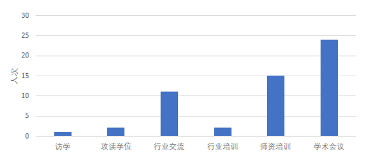 近三年来,公司有50余人次教师参加培训进修、行业中短期培训、学术会议、挂职锻炼等形式的交流,双师双能型教师占比45%,有1位老师在境外进行1年的访问学者研究,2位教师获批江苏省“青蓝工程”优秀青年骨干教师培养对象。其详细情况如图2所示。